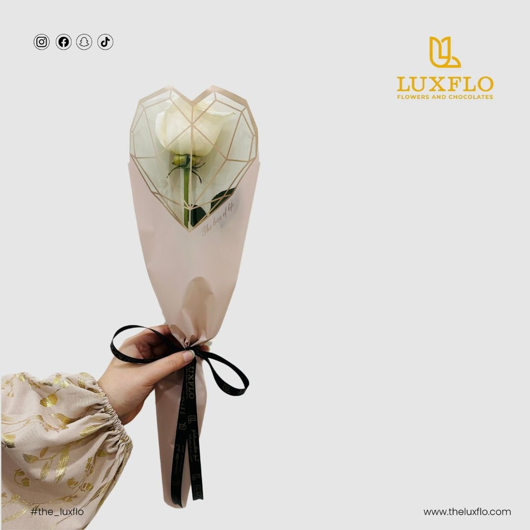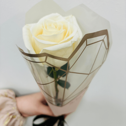 Call Us WhatsAppSingle white rose with royal wrap. Lovely white rose adorned with intricate royal wrap, conveying divine love.