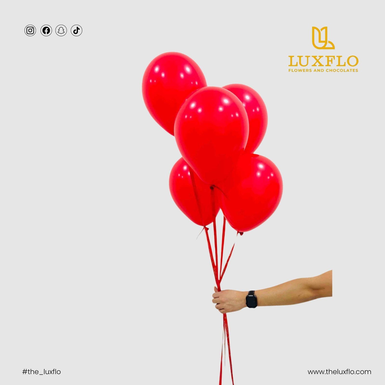A cheerful bundle of 5 vibrant 12-inch red helium balloons, floating high with love — includes a free greeting card to complete your surprise.