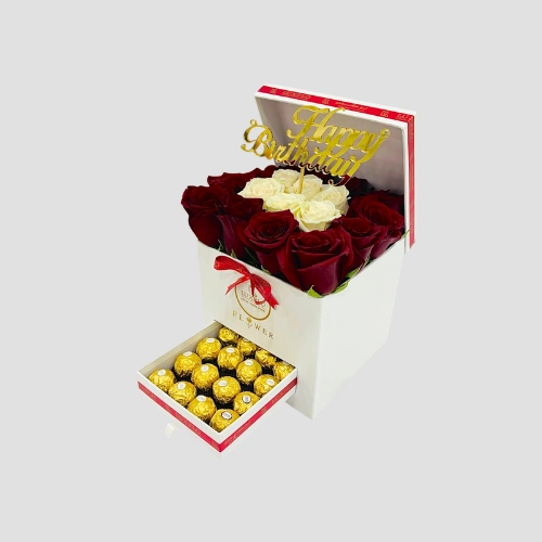 Call Us WhatsAppA charming gift set featuring an exquisite arrangement of red and white roses, paired with 20 indulgent Ferrero Rocher chocolates, elegantly presented in a luxurious box—perfect for making birthdays extra special.