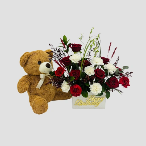 Call Us WhatsAppExtend warm birthday wishes with this gorgeous arrangement of roses, mix carnation, and ruscus leaves, paired with a happy birthday logo, in a white bag with a brown teddy bear.