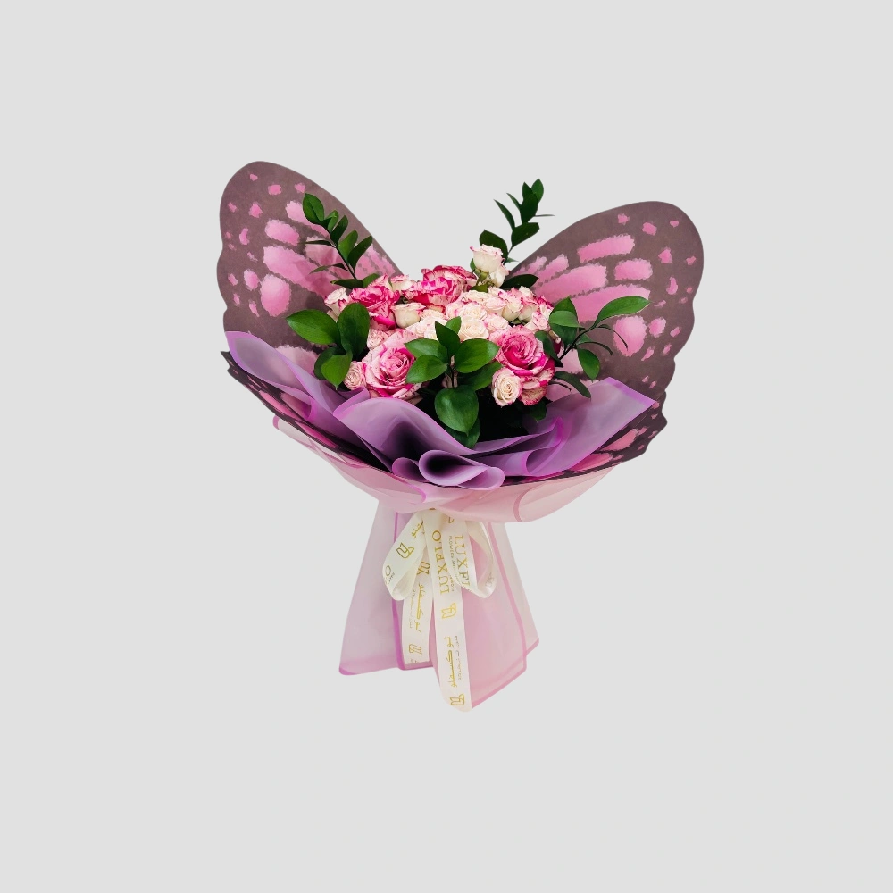 Call Us WhatsAppDelight your loved ones with this charming bouquet of pink and white baby roses, elegantly paired with fresh ruscus leaves and beautifully presented in a unique butterfly-style wrapping. Perfect for birthdays, anniversaries, thank-you gifts, or simply to brighten someone’s day, this arrangement symbolizes grace, love, and elegance. A thoughtful floral gift that adds a touch…