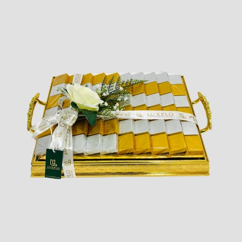 Marvel at the beauty of this stunning 1.26kg premium chocolate arrangement, beautifully presented in a golden tray.