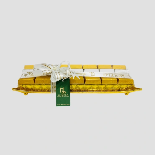 Treat your loved ones to a luxurious 440g premium chocolate arrangement, elegantly presented in a golden steel tray.