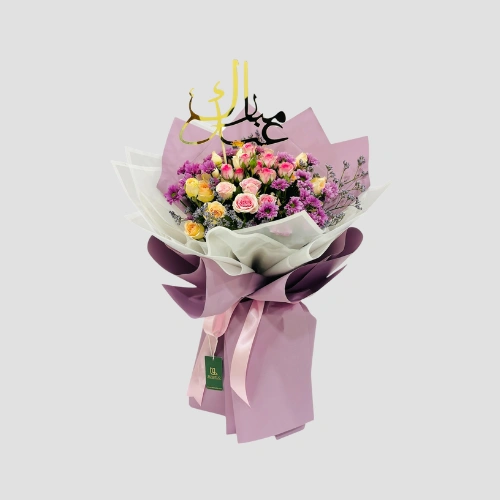 Call Us WhatsAppDelight your loved ones on Eid with this stunning bouquet of mix colors baby roses and pink Chrysanthemum santini, topped with a beautiful “Eid Mubarak” topper and wrapped in a luxurious purple and white multi-wrap.