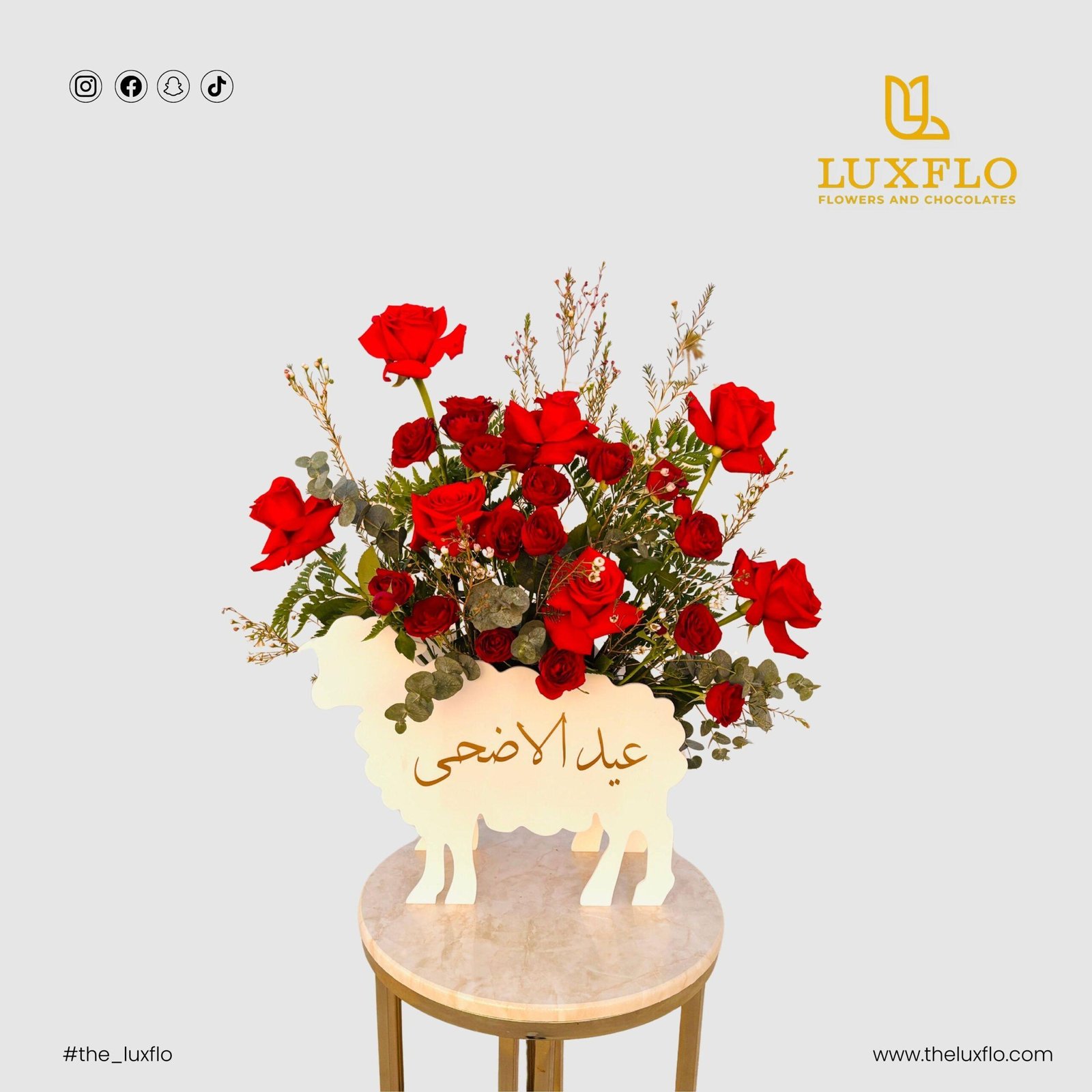 Call Us WhatsAppA radiant mix of red roses and red baby roses, accented with wax flowers and fresh eucalyptus — beautifully arranged in a charming acrylic sheep box. A rich and festive floral gift for Eid.