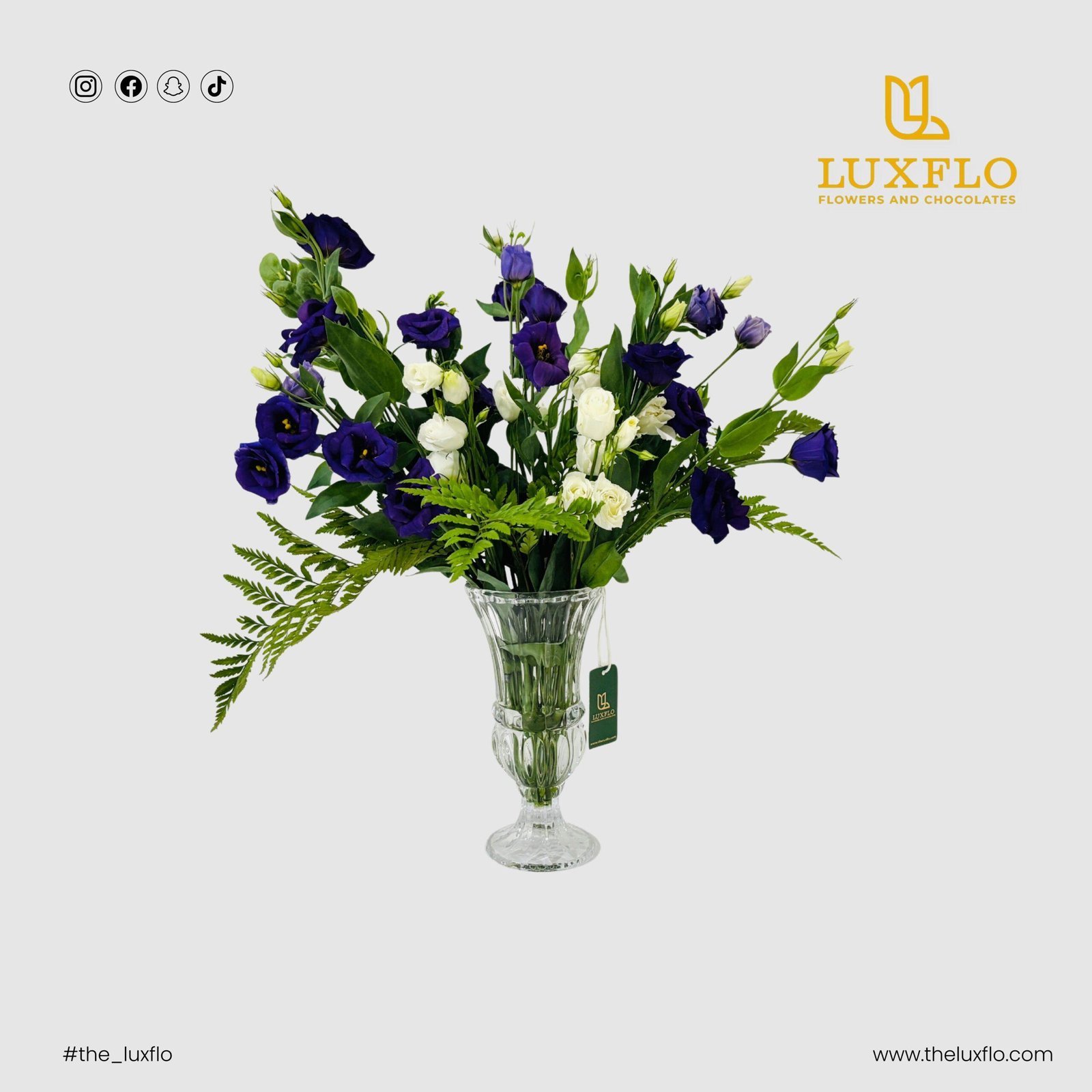 Call Us WhatsAppAn elegant fusion of violet and white Eustoma, complemented with rich green Leather Fern leaves. Arranged in a stylish vase, this design brings a graceful charm to any room or heart.