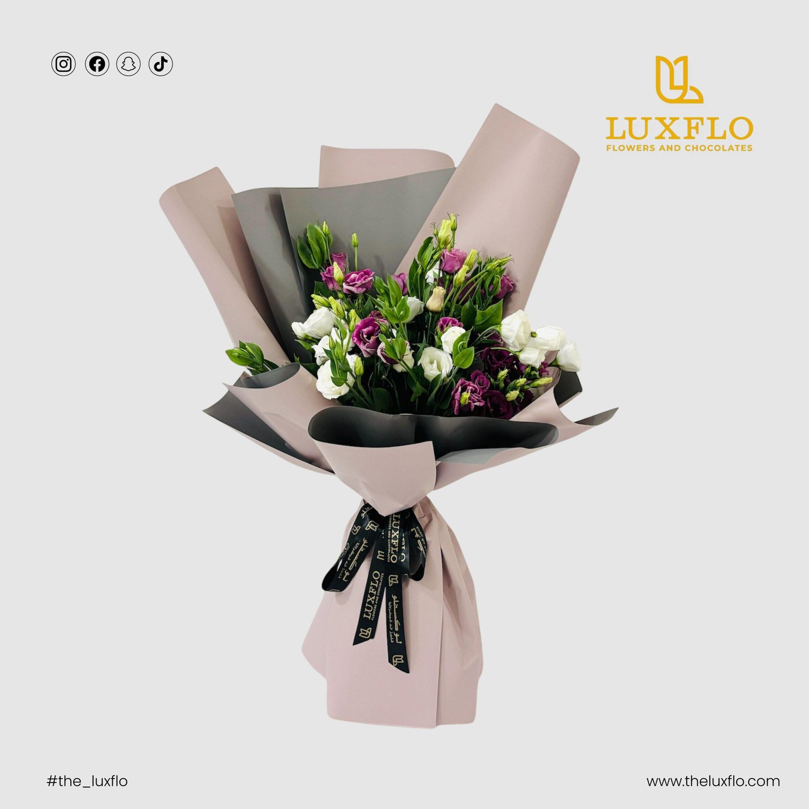 Call Us WhatsAppA dreamy bouquet of white and violet Eustoma blooms, wrapped in soft lilac and creamy beige tones — perfect for expressing gentle affection and sweet surprises.
