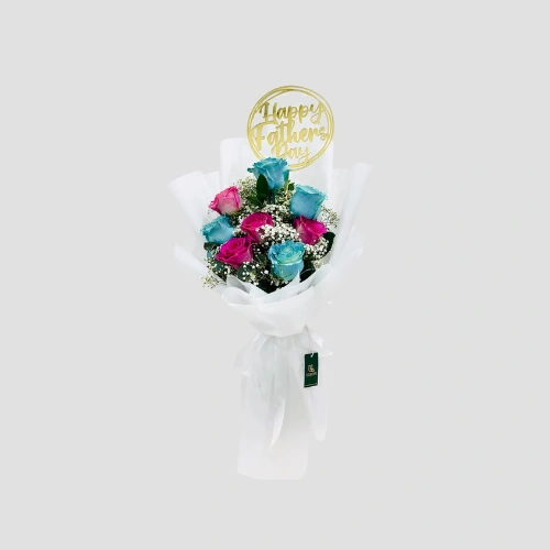 A graceful blend of soft pink roses symbolizing love and gratitude, and blue roses representing admiration and respect. Enhanced with delicate white gypsophila and lush greenery, this bouquet is wrapped in crisp white paper and topped with a “Happy Father’s Day” sign — a perfect balance of emotion and elegance.