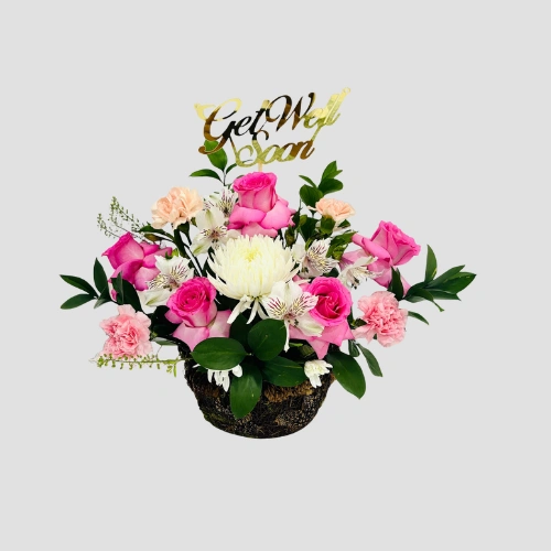 Pink roses, delicate carnations, and fresh greens come together in a serene vase arrangement — the perfect way to say “feel better soon.”