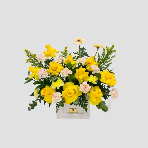 Call Us WhatsAppA radiant collection of soft yellow Roses, Carnations, and Gerberas, complemented by the golden hues of Solidago and lush green foliage, all gracefully arranged in a clear acrylic box. This warm and welcoming bouquet is perfect for birthdays, anniversaries, or any occasion where you want to shine a little sunshine on someone special.