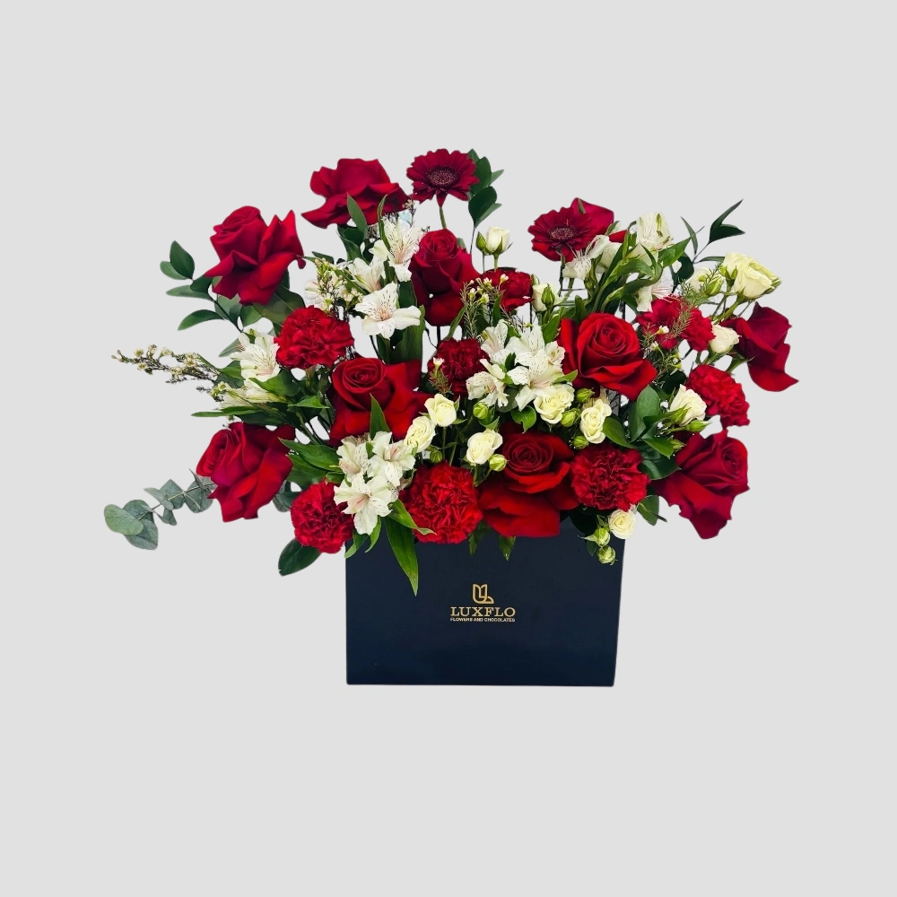 Call Us WhatsAppA stunning red and white floral arrangement featuring premium red roses, carnations, gerberas, alstroemeria, baby roses, ruscus leaves, and fresh eucalyptus. Beautifully designed in a stylish black acrylic holding box, this elegant creation is the perfect gift to express love, admiration, and heartfelt emotions to someone special.