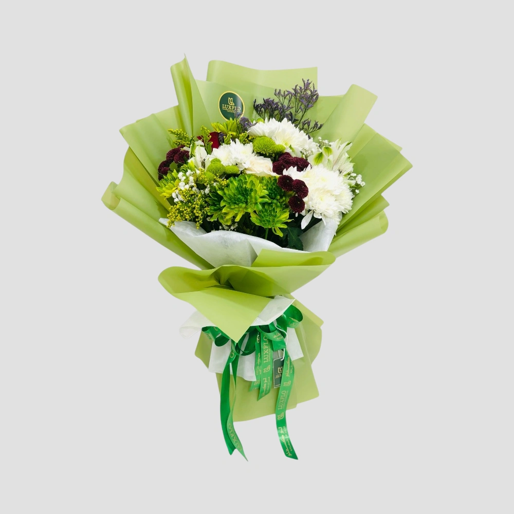 Call Us WhatsAppBring freshness and charm to any occasion with this elegant green-themed bouquet, featuring a beautiful mix of chrysanthemums, santini, alstroemeria, limonia, and solidago leaves. Expertly arranged in a stylish green and white multi-layer wrap, this bouquet symbolizes harmony, positivity, and natural beauty. Perfect for birthdays, anniversaries, get-well wishes, or as a refreshing gift to brighten…