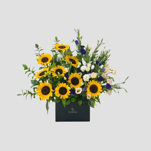 Bright Sunflowers paired with elegant Eustoma and lush greenery, carefully presented in a stylish acrylic box. This arrangement reflects happiness and peace — the perfect mix of energy and calm.