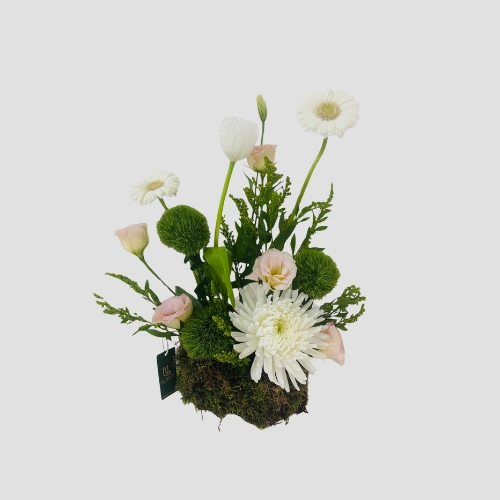 Call Us WhatsAppA graceful blend of White Tulips, Gerbera, and Eustoma, paired with Green Ball, Solidago, and decorative touches — all nestled in rich green moss. This natural yet sophisticated arrangement brings freshness and serenity to your table.