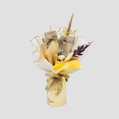 Call Us WhatsAppDelight in the spirit of Ramadan with this stunning bouquet featuring a Quran, prayer mat, and tasbih counter, perfectly arranged with dry flowers and multi-wraps.