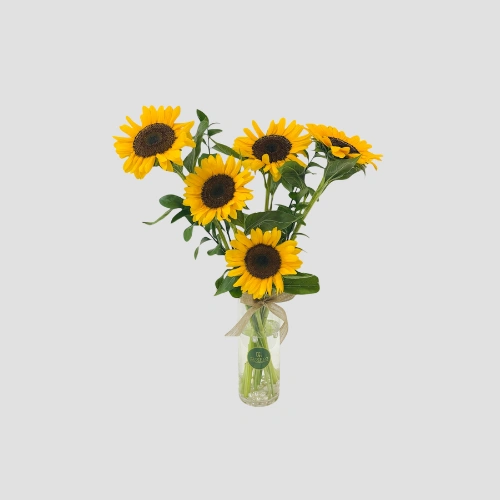 Call Us WhatsAppA radiant bunch of 5 cheerful sunflowers paired with fresh green ruscus leaves, arranged with care in a clear glass vase. A perfect balance of brightness and simplicity — ideal for brightening up any space.