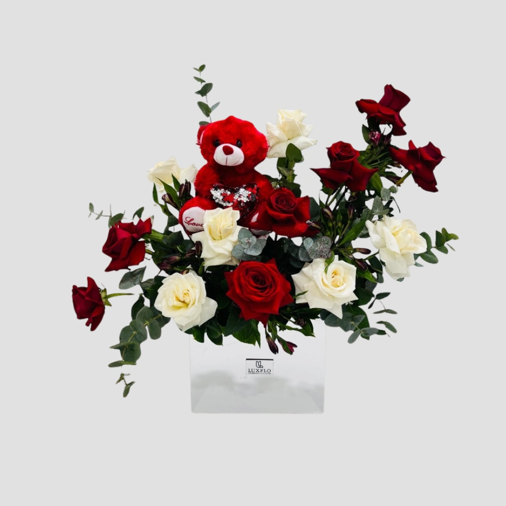 Call Us WhatsAppA charming arrangement of fresh red and white roses paired with alstroemeria and eucalyptus, beautifully presented in a stylish acrylic box and complemented by a cute small red teddy bear. This elegant combo is perfect for surprising your loved one and making any special moment truly memorable.