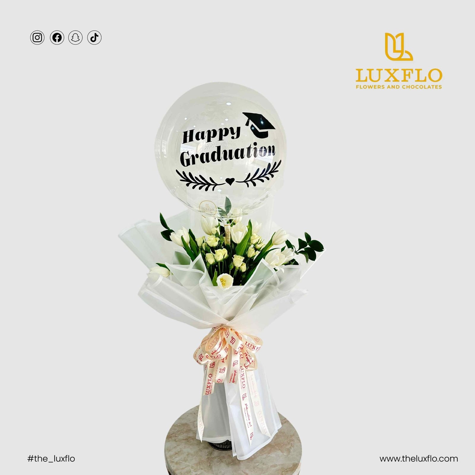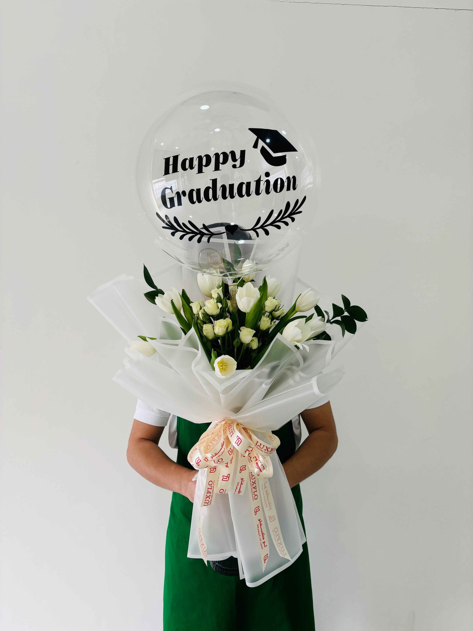 Call Us WhatsAppCelebrate the graduate’s achievement with 10 vibrant tulips, soft baby roses, and ruscus leaves. The “Happy Graduation” balloon adds a joyful touch to this elegant and festive bouquet.