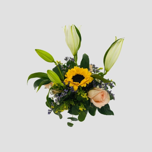 Call Us WhatsAppA soft, romantic round table arrangement, combining sunflowers, peach roses, and fragrant lilies, accented with gypsophila and lush eucalyptus leaves, making it suitable for elegant dinners or special occasions.