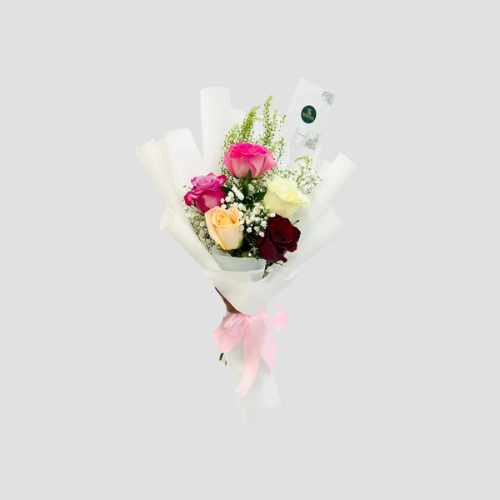 Call Us WhatsAppSend colorful wishes with this gorgeous bouquet of 5 mix color roses, lepidium, and gypsophila, wrapped in crisp white paper.
