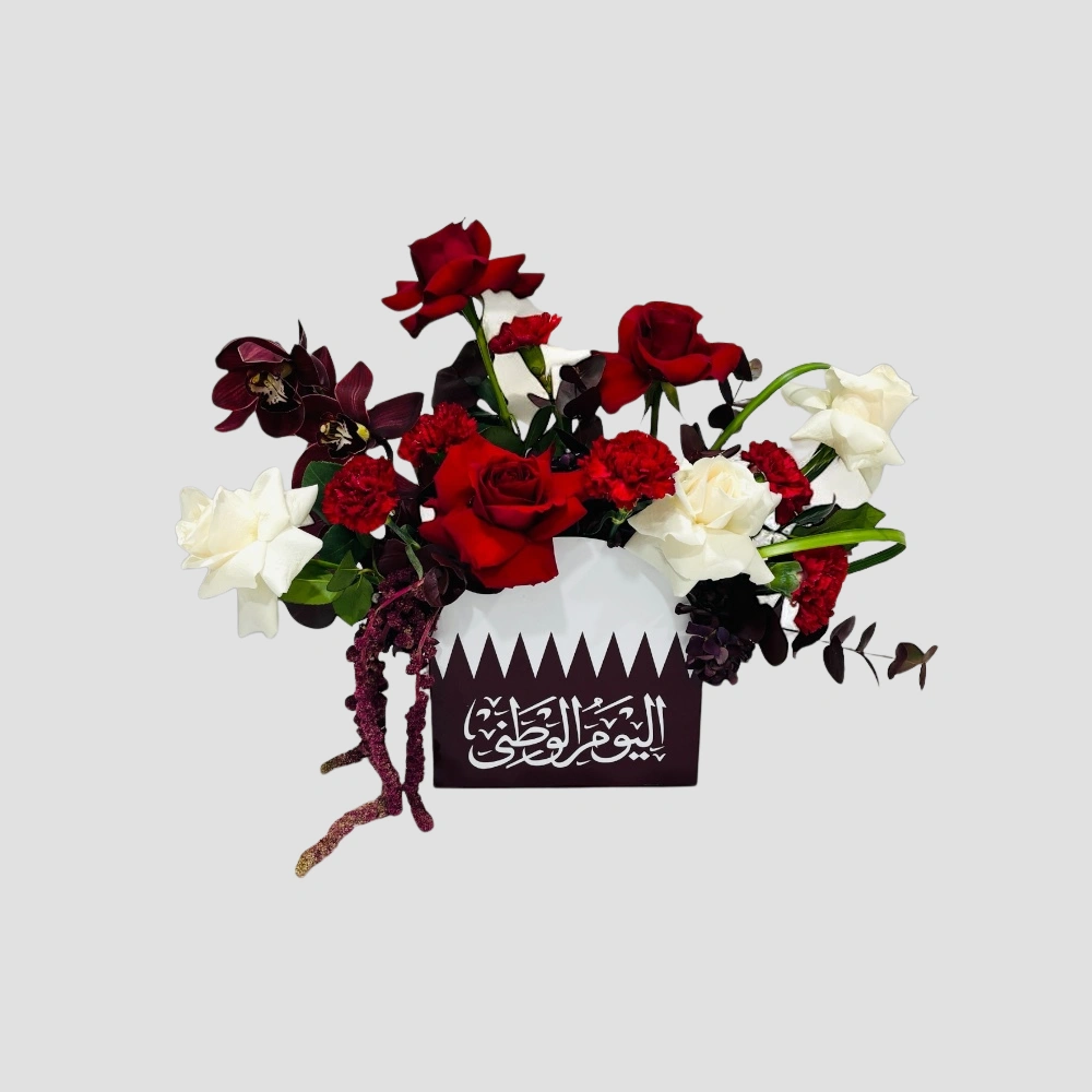 This stunning National Day acrylic box features a rich blend of hydrangea burgundy, red carnations, white and red roses, and fresh eucalyptus leaves. A perfect floral gift for celebrating with someone special.
