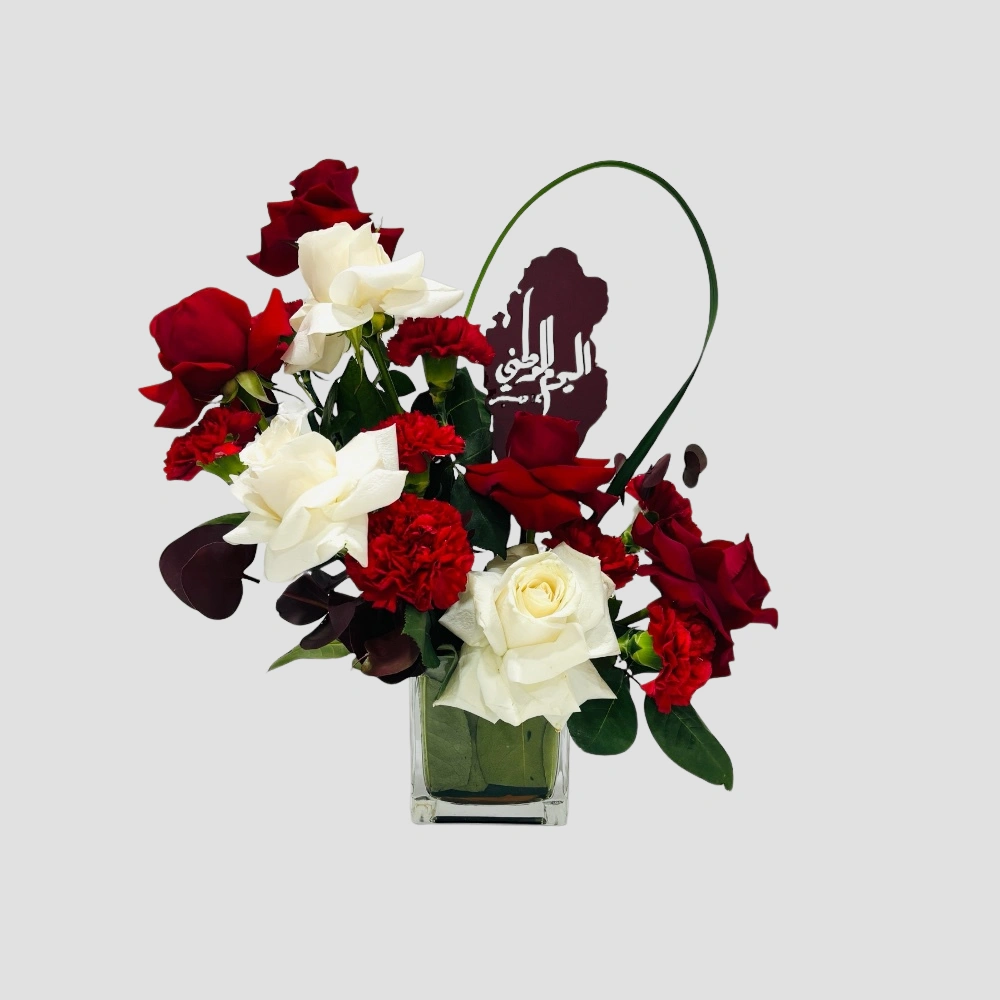 Call Us WhatsAppElegant arrangement featuring a combination of red and white roses and carnations, complemented by fresh eucalyptus leaves. Beautifully styled in a glass square vase and finished with a National Day topper a perfect choice for gifting and celebrations.