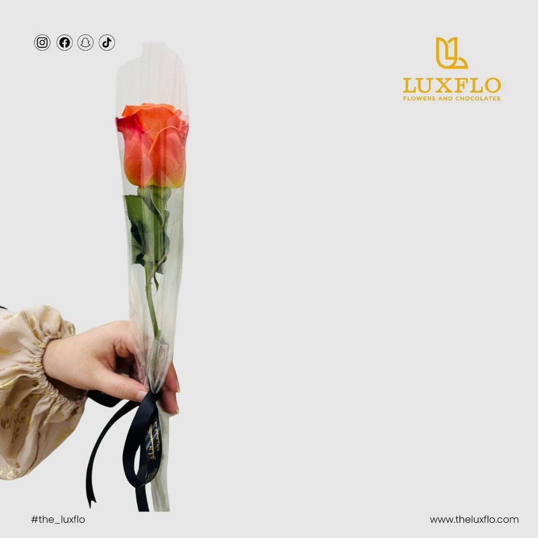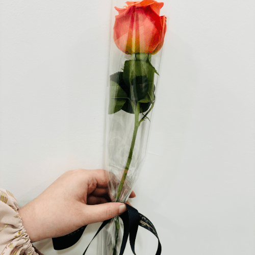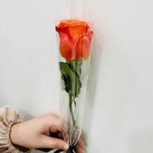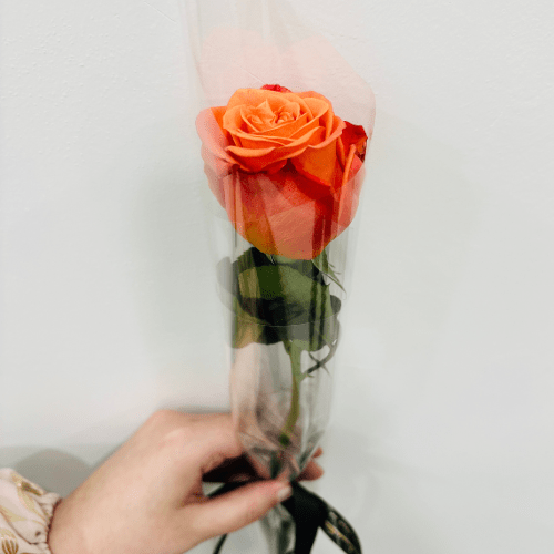 Single orange rose with clear wrap. ✨✨Delicate orange rose nestled in transparent wrap, conveying playful affection.