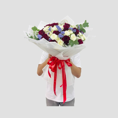 15 deep red roses with white baby roses, gypsophila, and eucalyptus — a bouquet that expresses devotion with a clean, classic white presentation.