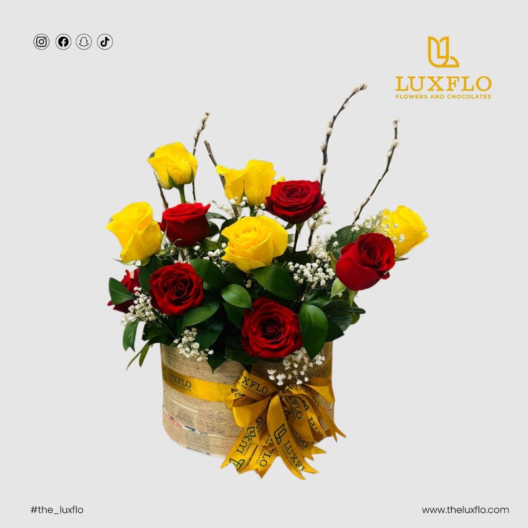 Call Us WhatsAppRed and yellow roses with gypso and Ruscus leaves 🍃 flower arrangement. Red and yellow roses merge with gypso and Ruscus, igniting passion and energy.