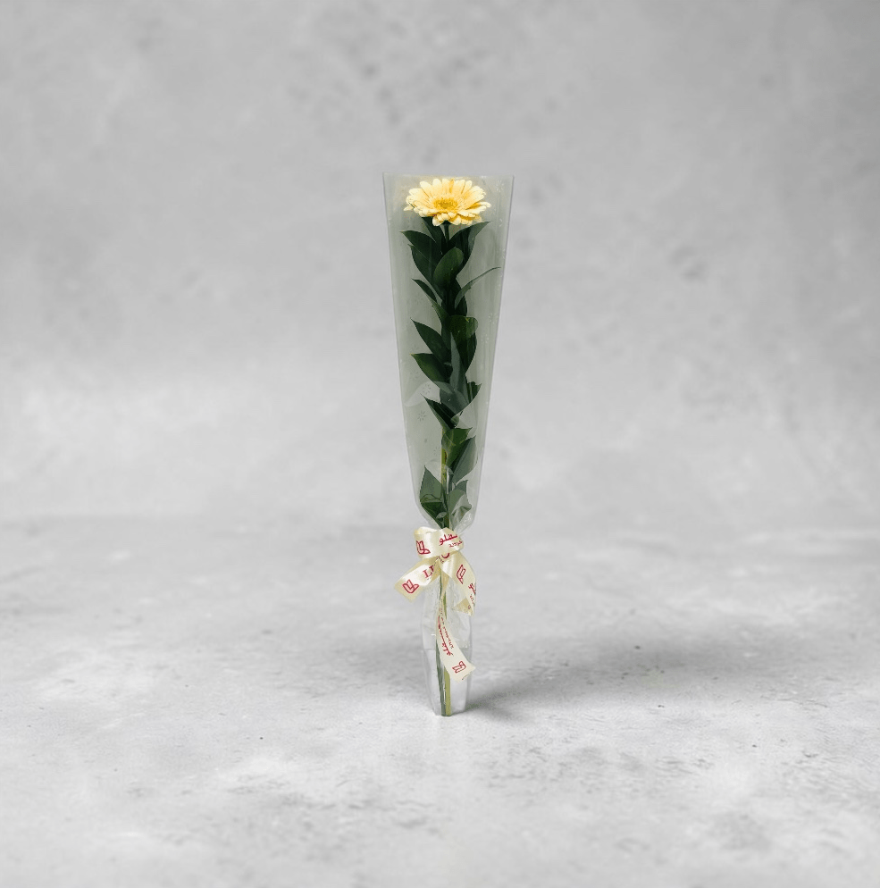 Call Us WhatsAppA single peach gerbera stem beautifully wrapped with fresh ruscus leaves an elegant, minimalist gift perfect for birthdays, thank-yours, or just-because moments.