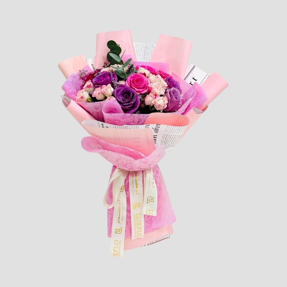 Call Us WhatsAppA charming mix of pink and purple roses, complemented by baby roses and fresh green leaves, beautifully arranged in multi-shaded pink wrapping. Perfect for adding elegance and warmth to any celebration.