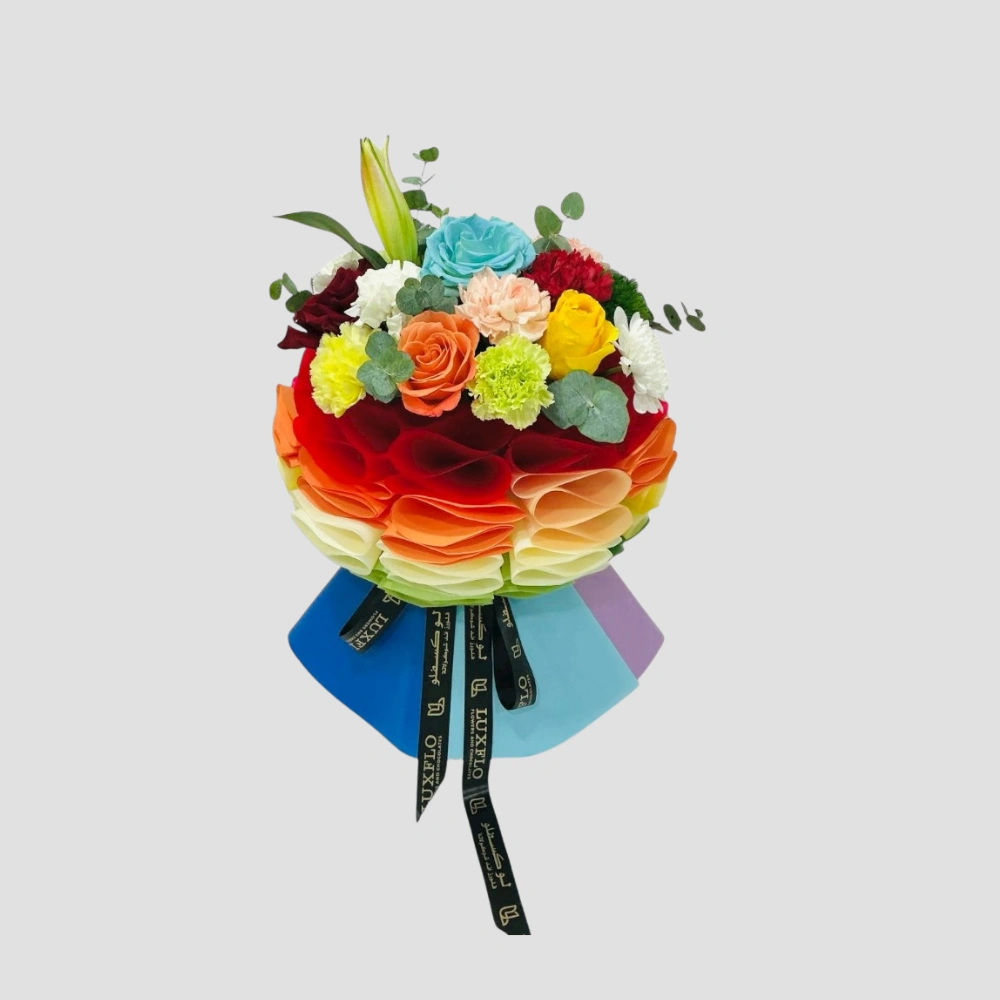 Call Us WhatsAppBrighten any celebration with this vibrant round-shaped bouquet, featuring a cheerful mix of roses in multiple colors, elegant lilies, carnations, green ball flowers, chrysanthemums, and fresh green leaves. Beautifully presented in a rainbow multi-color wrapping, this arrangement symbolizes happiness, love, and positivity. Perfect for birthdays, anniversaries, congratulations, or festive occasions, this colorful bouquet is a…