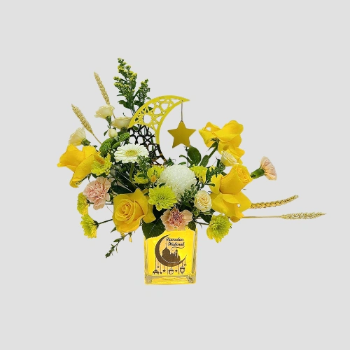 Call Us WhatsAppA stunning mix of Roses, Baby Roses, and Gerberas, complemented with Chrysanthemums and Solidago leaves, beautifully arranged in a light vase. Wishing you a blessed Ramadan filled with peace and joy!