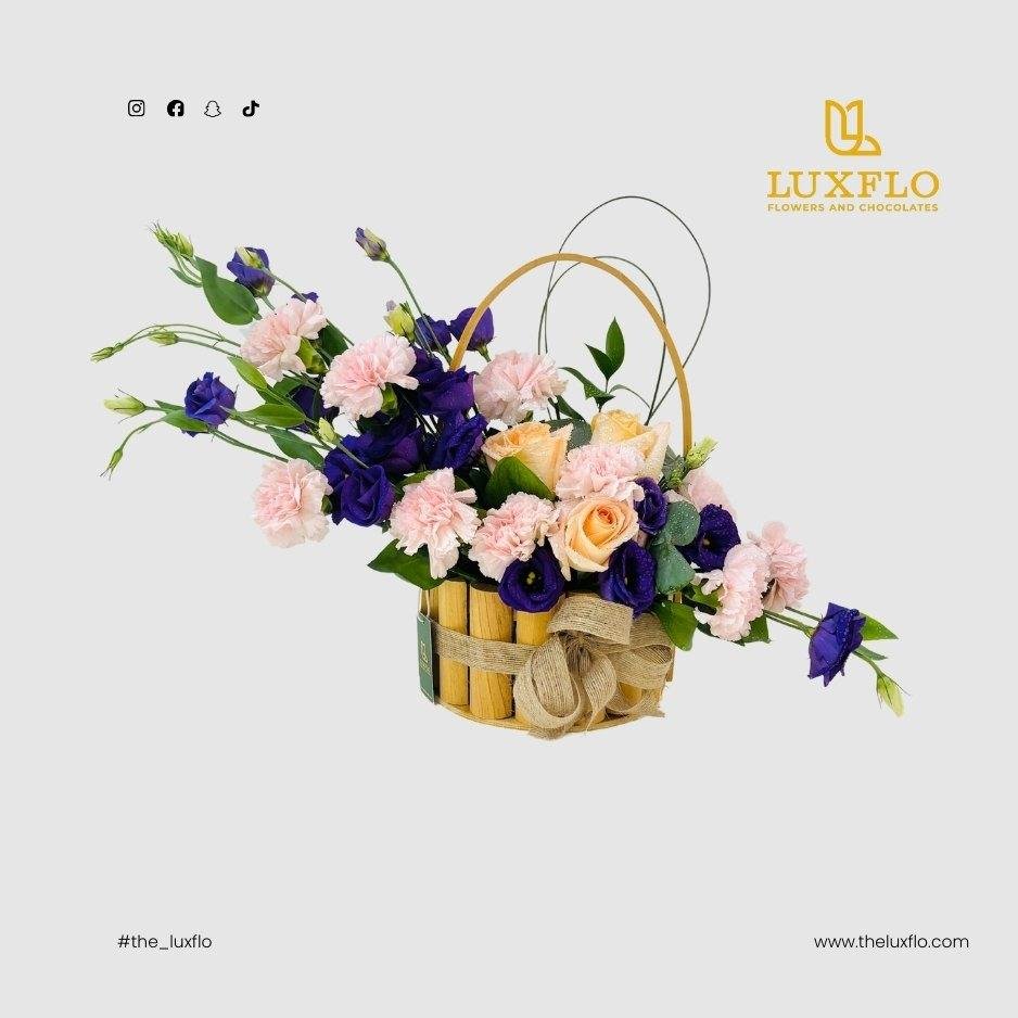 Call Us WhatsAppA majestic blend of violet Eustoma, lush Carnations, and classic Roses, artfully arranged with Ruscus greenery in a rustic wooden box. This design brings a regal charm and timeless elegance to any occasion.