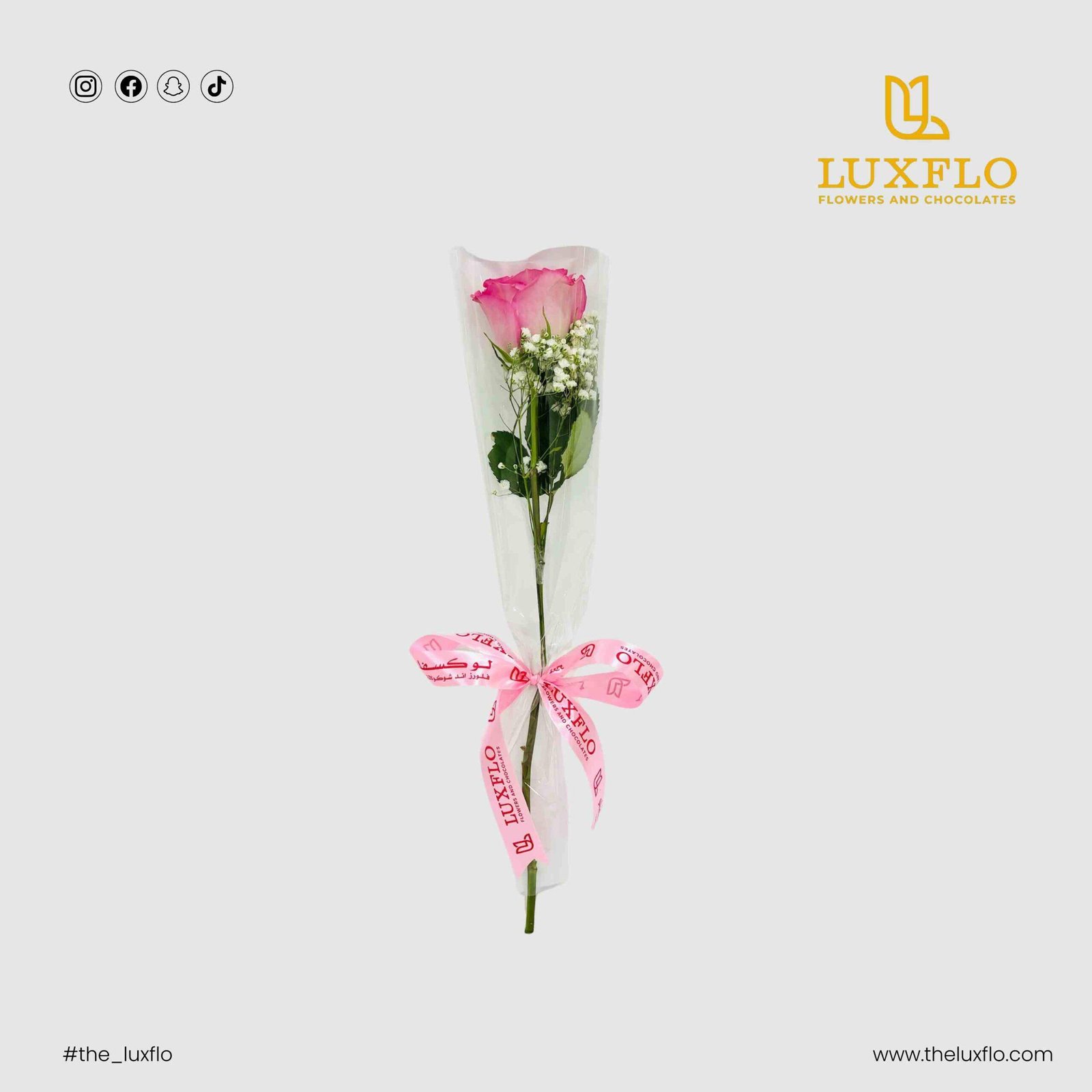 A single pink rose paired with delicate gypsophila, wrapped in soft white for a touch of timeless elegance.