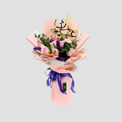 Call Us WhatsAppSend soft Eid wishes with this gorgeous bouquet of light pink roses, lepidium, statice, and eucalyptus leaves, featuring a sweet “Eid Mubarak” topper.