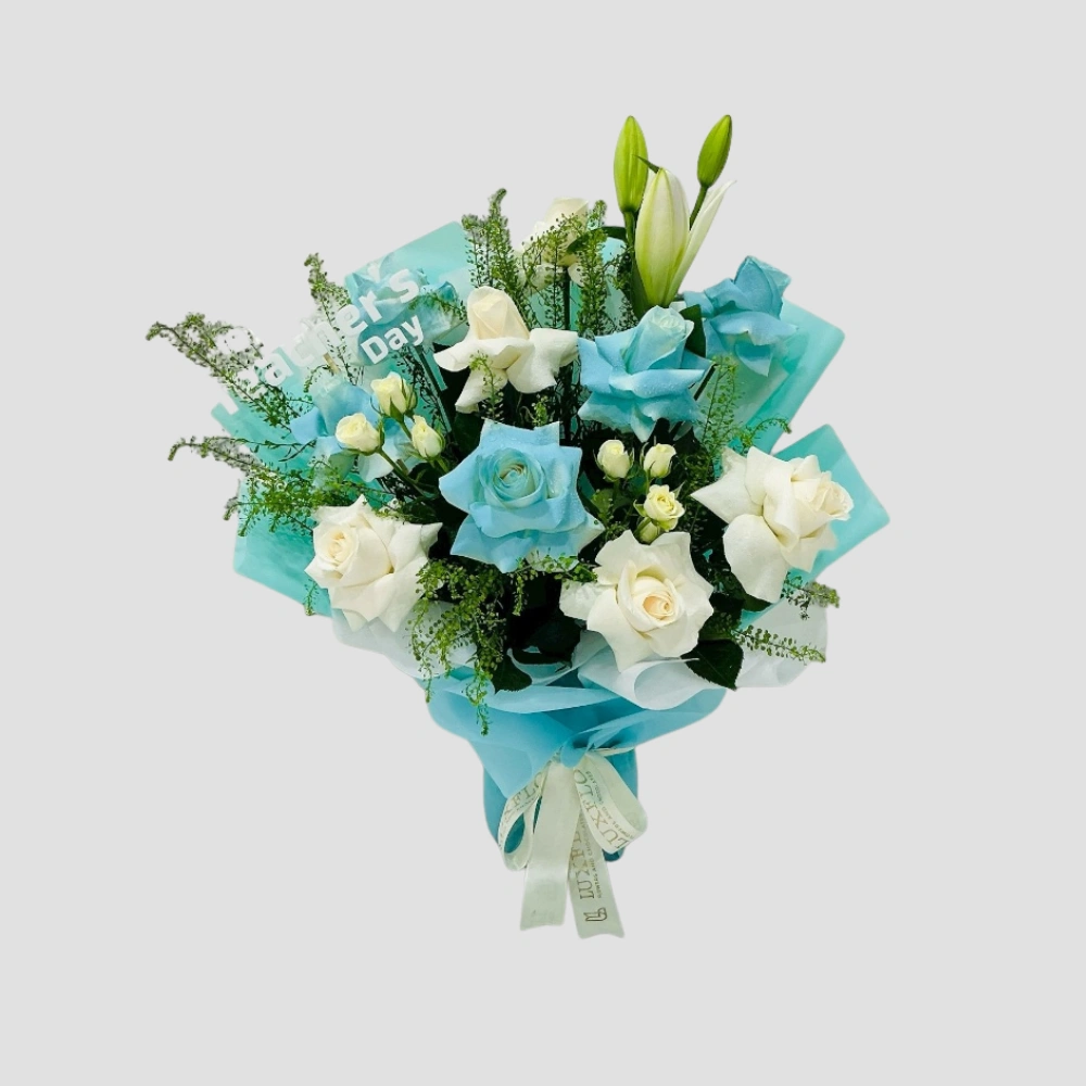 Call Us WhatsAppShow your gratitude with this stunning Teacher’s Day bouquet, featuring a graceful mix of white and blue roses, elegant white lilies, delicate baby roses, and fresh green leaves. Beautifully arranged in a stylish blue wrapping and finished with a “Happy Teacher’s Day” topper, this floral gift is a perfect way to honor and appreciate teachers…