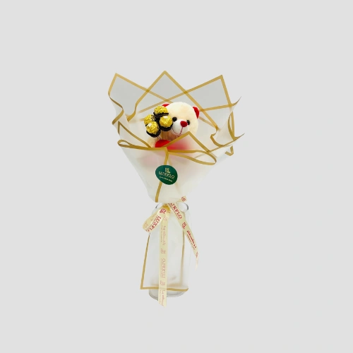 This adorable bouquet includes a soft teddy and 4 golden Ferrero Rocher chocolates, all wrapped with love — ideal for showing affection in a sweet way.