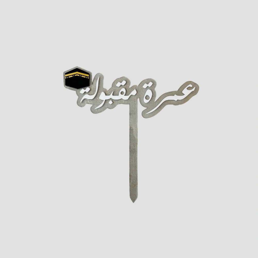 Call Us WhatsAppA stylish transparent Arabic acrylic topper featuring the phrase “Umrah Maqboolah” (عمرة مقبولة), meaning “May your Umrah be accepted.” Perfect for enhancing flower bouquets, chocolate boxes, and special gift arrangements for someone returning from Umrah. This elegant decorative topper adds a meaningful and spiritual touch to welcome gifts and celebration presentations.
