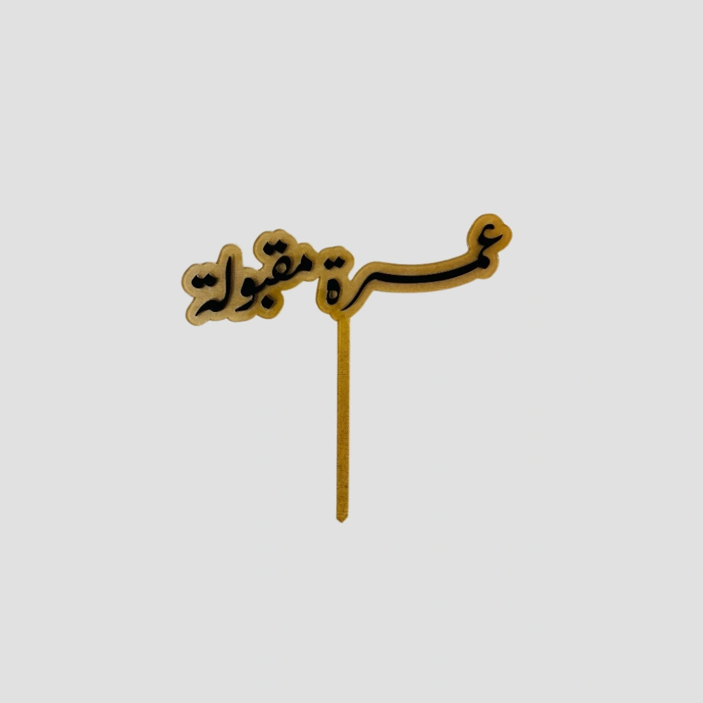 Call Us WhatsAppAn elegant transparent Arabic acrylic topper featuring the phrase “Umrah Maqboolah” (عمرة مقبولة), meaning “May your Umrah be accepted.” Ideal for decorating flower bouquets, chocolate boxes, and special gift arrangements for someone returning from Umrah. This premium decorative topper adds a meaningful and spiritual touch to welcome and celebration gifts.