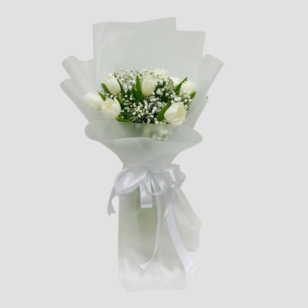 Call Us WhatsAppElegant white tulips paired with gypsophila, beautifully arranged in premium white wrapping a perfect choice for any occasion.
