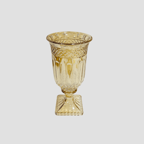 Elegant and timeless, this 30 cm tall flower vase features intricate cut-glass patterns and a fluted top, crafted in a rich amber-gold hue. Its pedestal base and vintage-inspired design make it a perfect centerpiece for classic or modern floral arrangements.