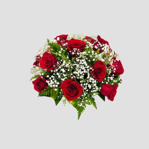Call Us WhatsAppA round, luxurious arrangement of rich red roses, softened by clouds of gypsophila and framed with textured messengina and leather fern leaves. A timeless design that speaks of love with quiet intensity and graceful charm — suitable for any space, from home corners to office desks.