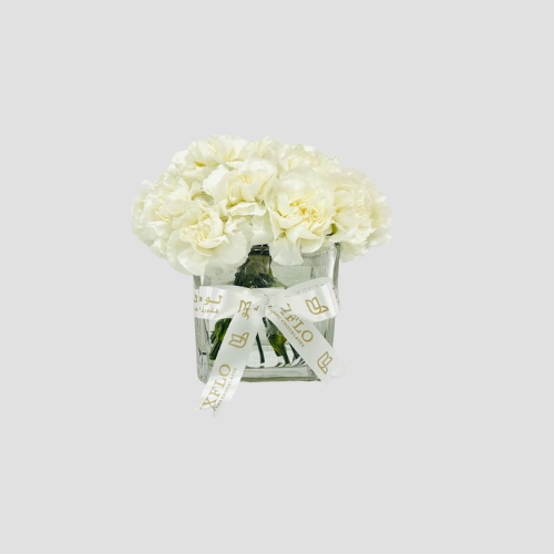 Call Us WhatsAppA timeless arrangement of 20 pristine white carnations in a sleek square vase — a pure expression of grace and modern simplicity, perfect for any room or occasion.