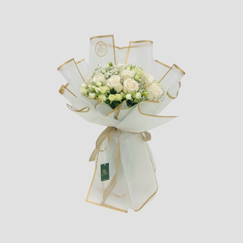Call Us WhatsAppThis soft-spoken stunner features layers of fresh white roses and baby roses embraced by wisps of Gypsophila. Wrapped in white, it speaks volumes through subtlety – ideal for expressing love, sympathy, or peaceful joy.