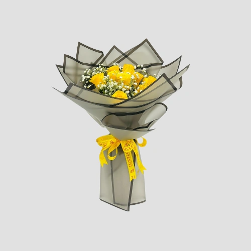 A classic bouquet of 10 deep Yellow roses paired with airy gypsophila, wrapped in elegant gray — a graceful expression of love.